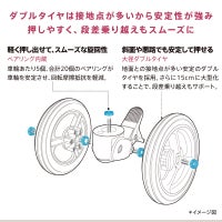 ■ダブルタイヤは接地点が多いから安定性が強み。押しやすく、段差乗り越えもスムーズに。