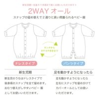 おむつ替えが頻繁な新生児期は筒型ドレスで、動きが活発になってくる乳児期は股割れカバーオール、股スナップの付け替えで2ウエイに使えます。