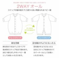 おむつ替えが頻繁な新生児期は筒型ドレスで、動きが活発になってくる乳児期は股割れカバーオール、股スナップの付け替えで2ウエイに使えます。