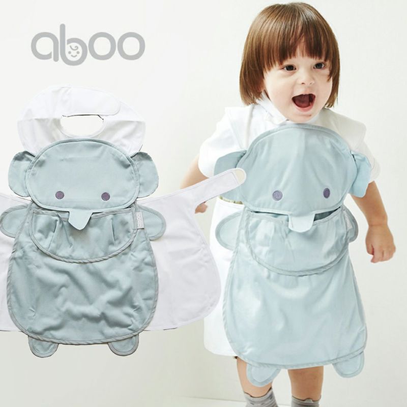 お手入れらくらく 子どもが笑顔になるかわいい動物デザイン aboo ぞうさん お食事エプロン 【ab-06a11BL】ブルーグレー ロング丈アブー 出産祝い ギフト プレゼント ベビー 6ヵ月~3歳前後 男の子 女の子 離乳食 エプロン 防水 ポケット付き マジックテープ 洗濯可 持ち運び 保育園 お出かけ用 おしゃれ