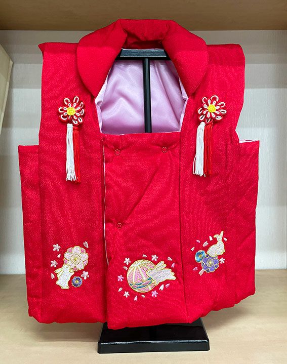 ひな祭り 被布 赤 ちりめん うさぎに毬桜【002】飾りスタンド付