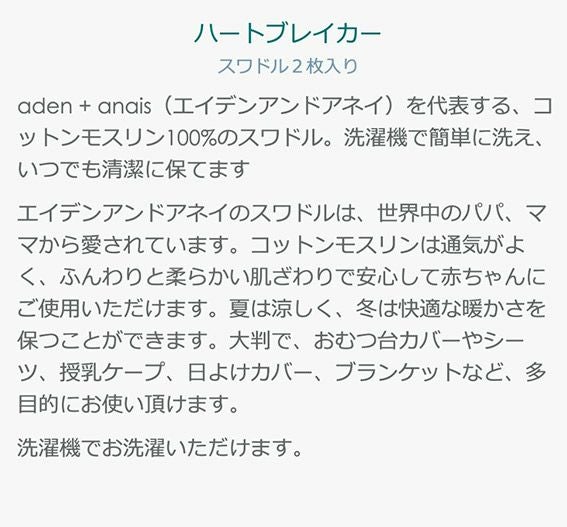他の画像を見る エイデンアンドアネイのスワドルは、出産準備やご出産祝いの贈り物としても人気のアイテムです。 エイデンアンドアネイ モスリン コットン 2枚セット ハートブレイカー【4055】日本正規品商品 おくるみ aden+anais スワドル アフガン 2枚パック heart breaker 出産祝い プレゼント ギフト swaddle ふわふわ 柔らかい オールシーズン 定価 ¥ 4,730 のところ 当店特別価格 ¥ 4,730 税込 カートに入れる お気に入りに登録する